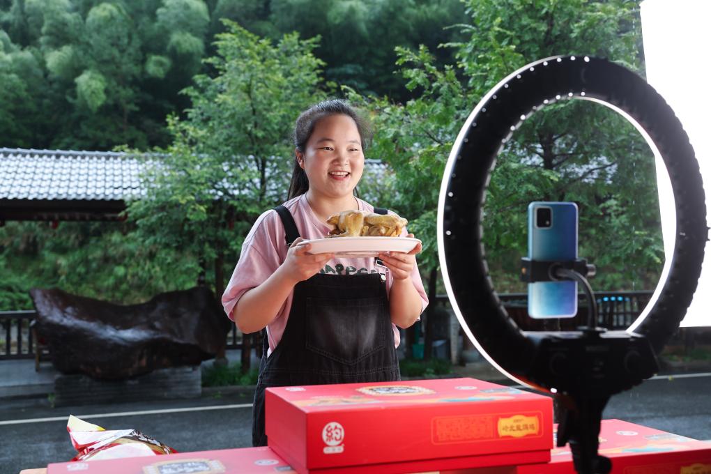 2024年9月19日,浙江省诸暨市岭北镇一位主播在直播销售岭北盐焗鸡。 新华社记者 徐昱 摄