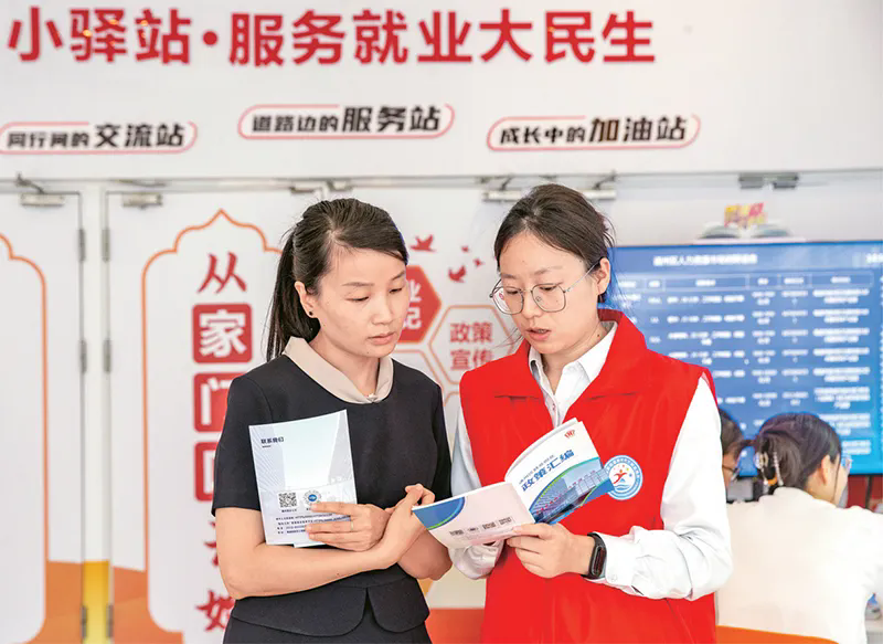 零工市场是向灵活就业人员与用工主体提供就业服务的重要载体。图为2024年9月3日,江苏省南通市通州区万达广场“零工驿站”内,就业服务人员在向求职者介绍就业创业政策。 人民图片 翟慧勇/摄