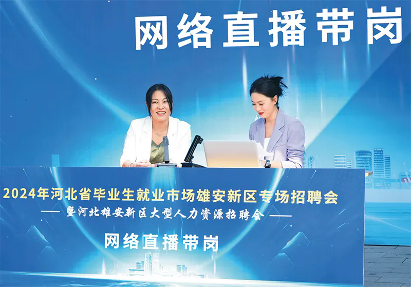 高校毕业生等青年群体就业是就业工作的重中之重,事关就业基本盘的稳定。2024年9月25日,雄安新区举办2024年河北省毕业生就业市场雄安新区专场招聘会暨河北雄安新区大型人力资源招聘会。图为当日招聘单位代表在现场进行网络直播带岗。 新华社发 落飞麟/摄