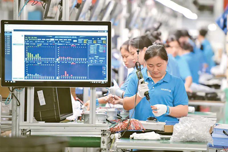 坚持依靠发展促进就业,在构建现代化产业体系的过程中不断提升就业带动力。图为2024年9月27日,在湖南省长沙市宁乡市金洲新城一家智能电器公司,工作人员在生产线上作业。 新华社记者 陈泽国/摄